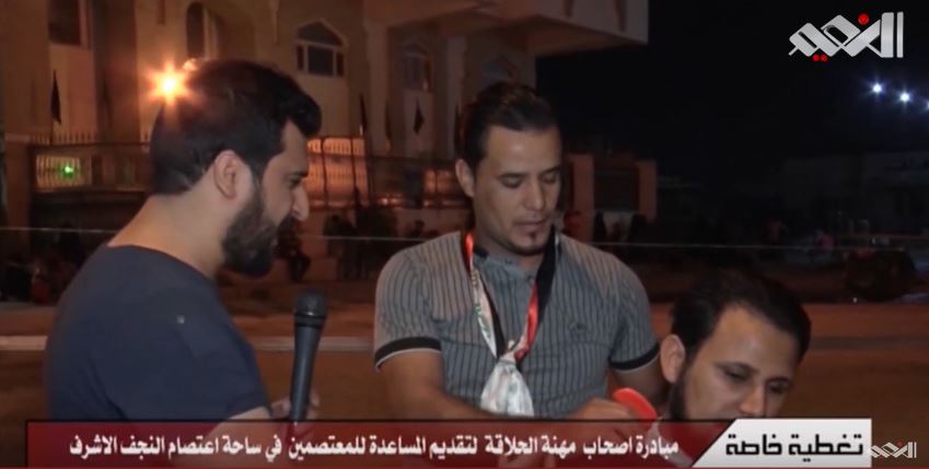 أصحاب مهنة الحلاقة يقدمون المساعدة للمعتصمين في ساحة الاعتصامات بالنجف الأشرف