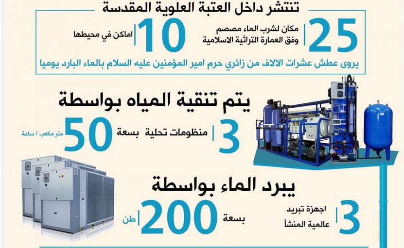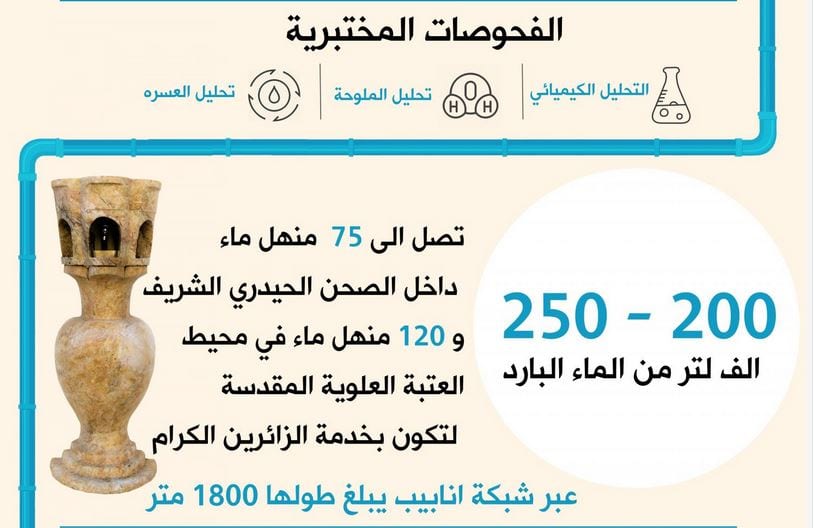 ينهل أكثر من ( 200 ) ألف لتر ماء بارد، منها الزائرون من خلال ( 75 ) منهلاً داخل الصحن العلوي الشريف فيما ينتشر ( 120 ) اُخرى في محيط العتبة المباركة.