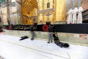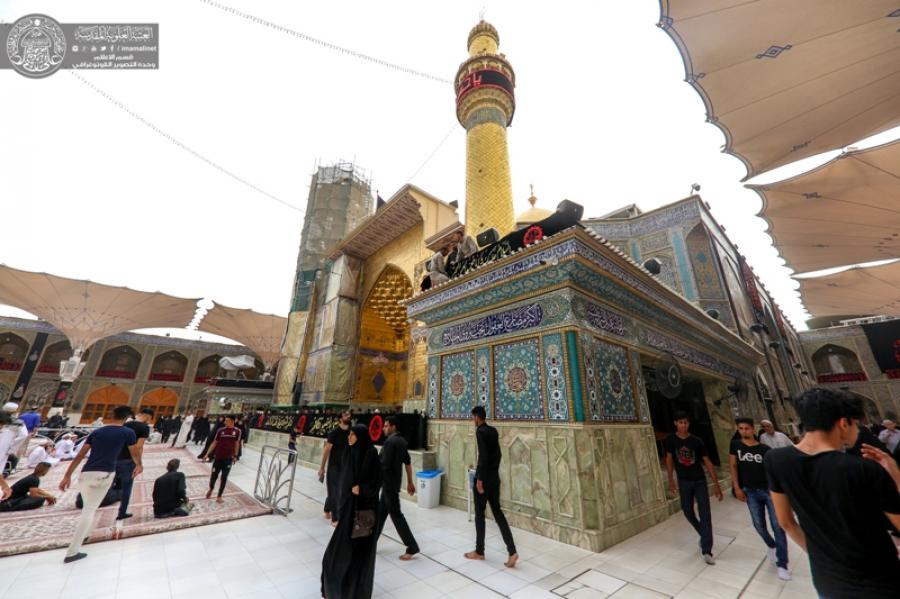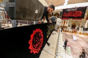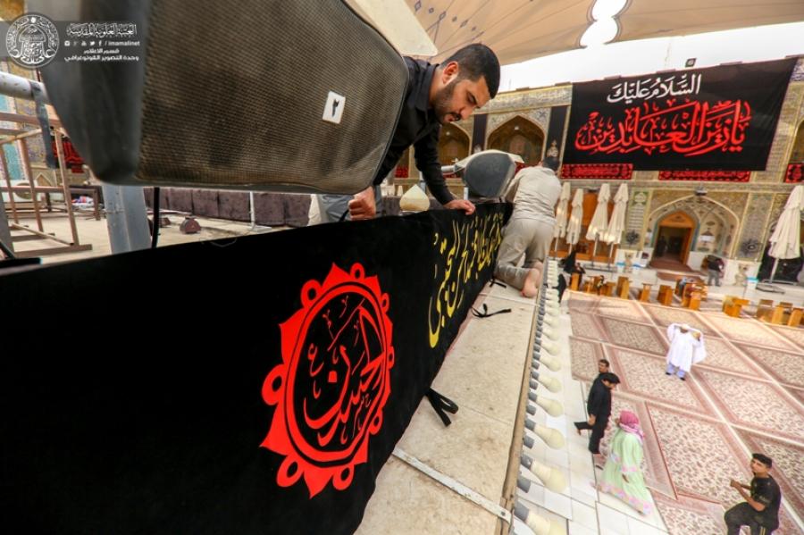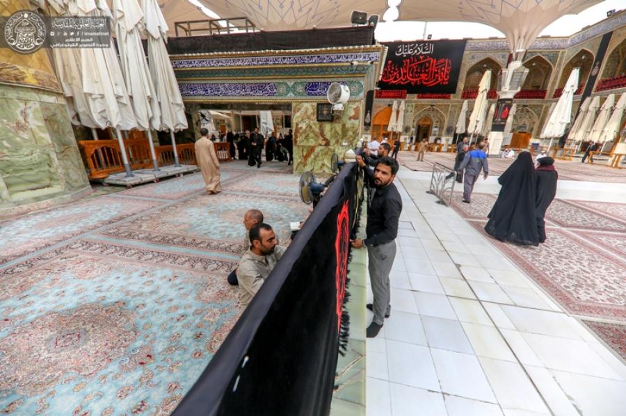 نشرت الكوادر العاملة في هيئة المواكب الحسينية في العتبة العلوية المقدسة معالم الحزن والسواد في أرجاء الصحن الحيدري الشريف والمرقد العلوي الطاهر ، إيذاناً بإحياء ذكرى شهادة الإمام الحسن المجتبى (ع) اليوم السابع من شهر صفر.