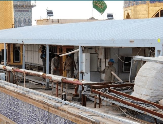 تواصل الكوادر الهندسية والفنية في العتبة العلوية المقدسة ولليوم الرابع على التوالي أعمالها بخصوص رفع أجهزة التبريد من القبة الشريف لنقلها إلى مكانها الجديد في مشروع توسعة صحن فاطمة (ع).