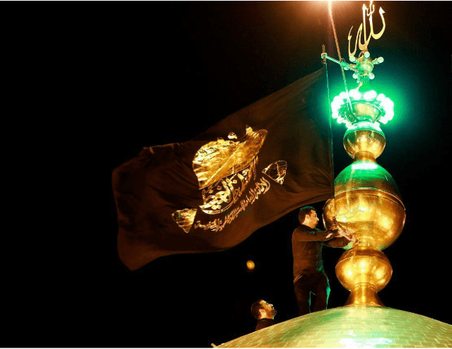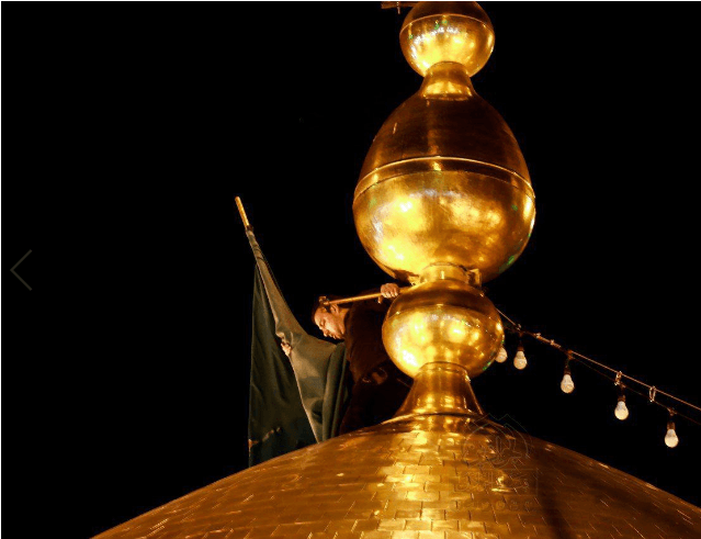 صور استبدال رايتي قبتي الإمامين الجوادين (ع) إيذاناً ببدء مراسم الحزن والعزاء