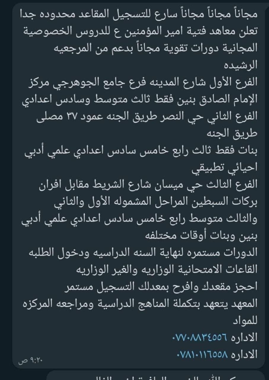 طبعاً وأمام ما نشاهد ونسمع من الأسعار العالية التي يتم تقاضيها من الطلبة في المدارس الأهلية والمعاهد الخاصة والتي تصل إلى أكثر من ثلاثة ملايين دينار. تأتي هذه المبادرة لتكون نافذة أمل للطلبة سيما ذوي الدخل المحدود. لتطوير مستوياتهم الدراسية وتحسين ادائهم بما يضمن لهم تحقيق افضل النتائج وأعلى الدرجات.